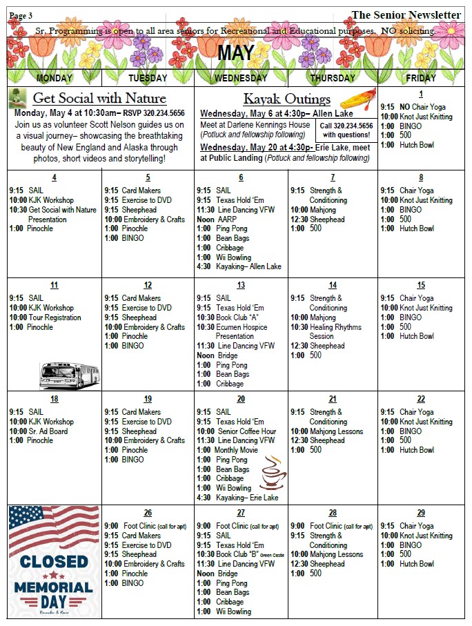 Keep in touch with all of the programs, tours, services and activities designed for people age 55 and over by downloading the Senior Programming Calendar.