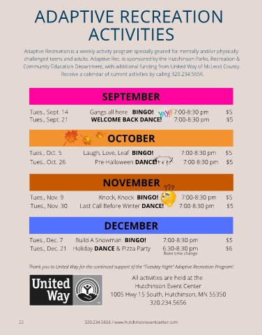 challenged teens and adults. Adaptive Rec. is sponsored by the Hutchinson Parks, Recreation &